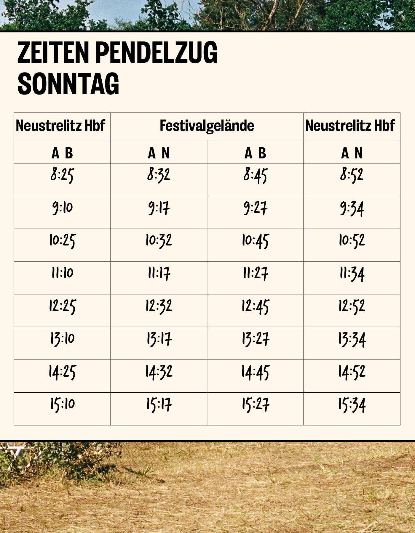 Wir beginnen mit konkreteren Zeitplänen für das Fest: Wer als nächsten Stop "Neustrelitz Hbf" anfährt, kann danach direkt den Pendelzug zum Festivalgelände nehmen. 🚋